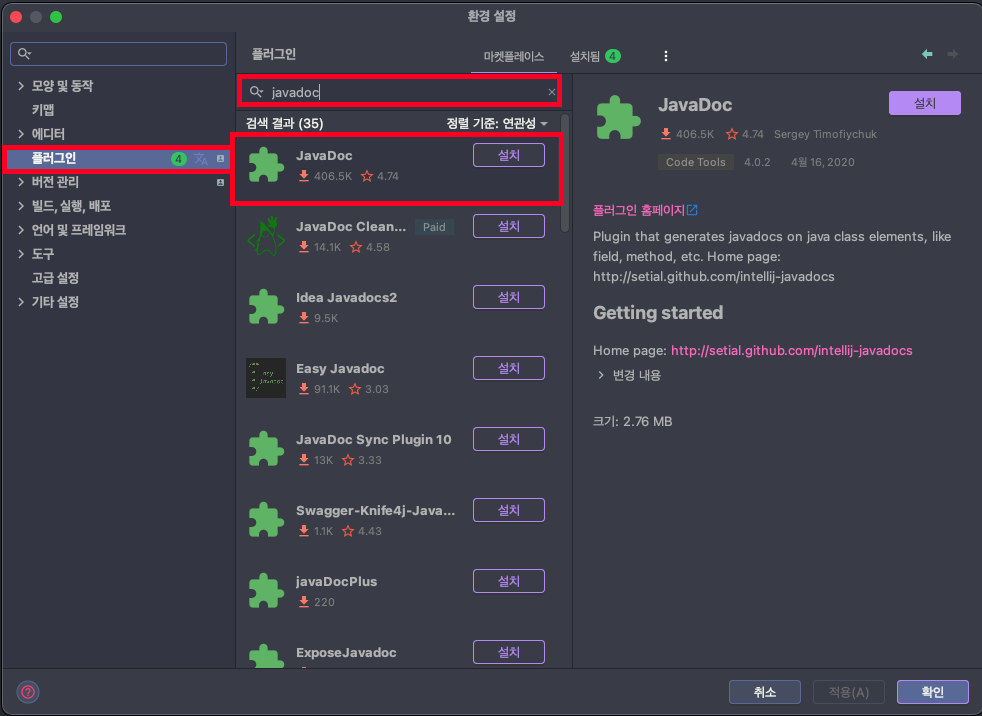 2. 플러그인(Plugins) - “javadoc” 검색 - “설치” 버튼을 클릭합니다.