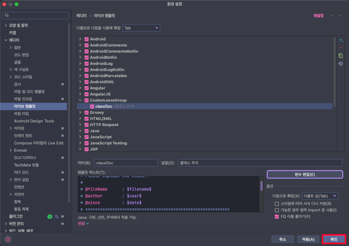 3) 라이브 템플릿 기능을 이용한 파일 주석 생성 방법