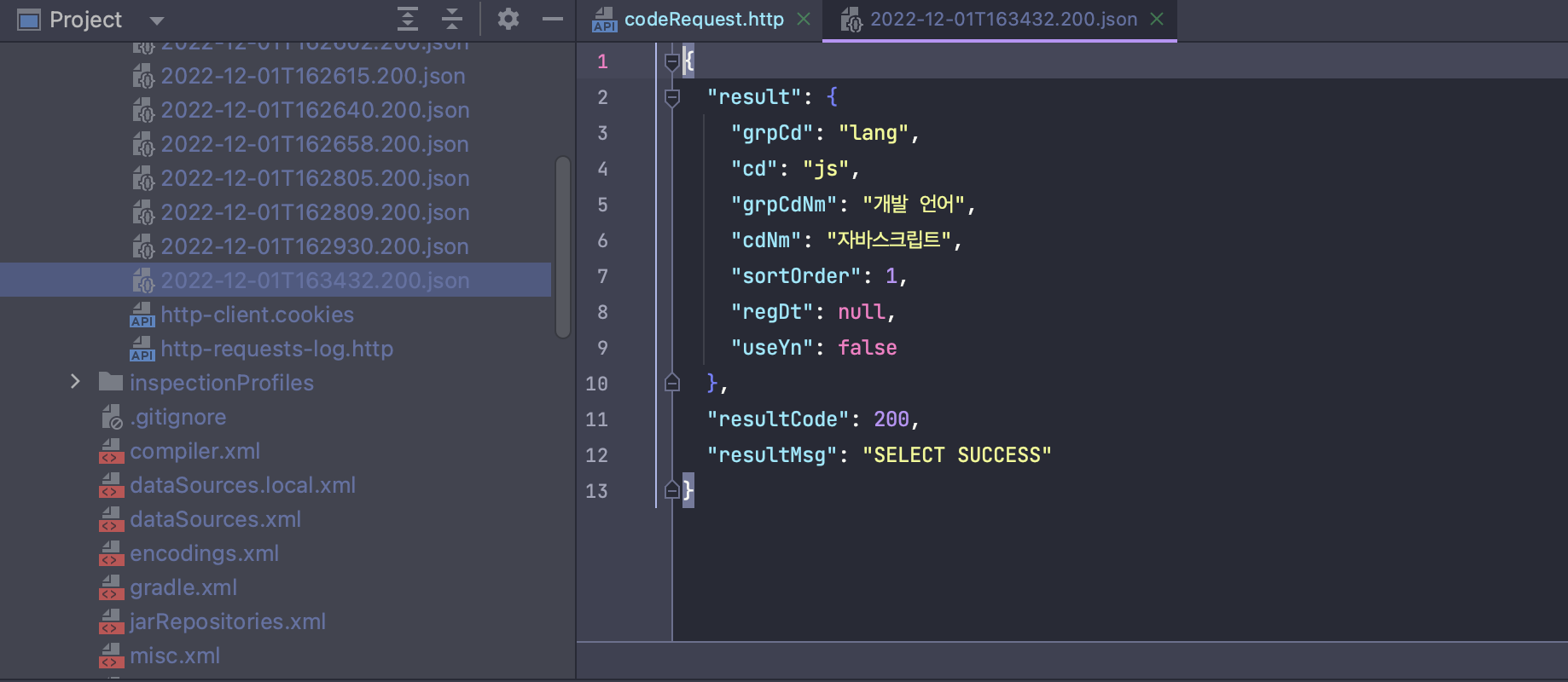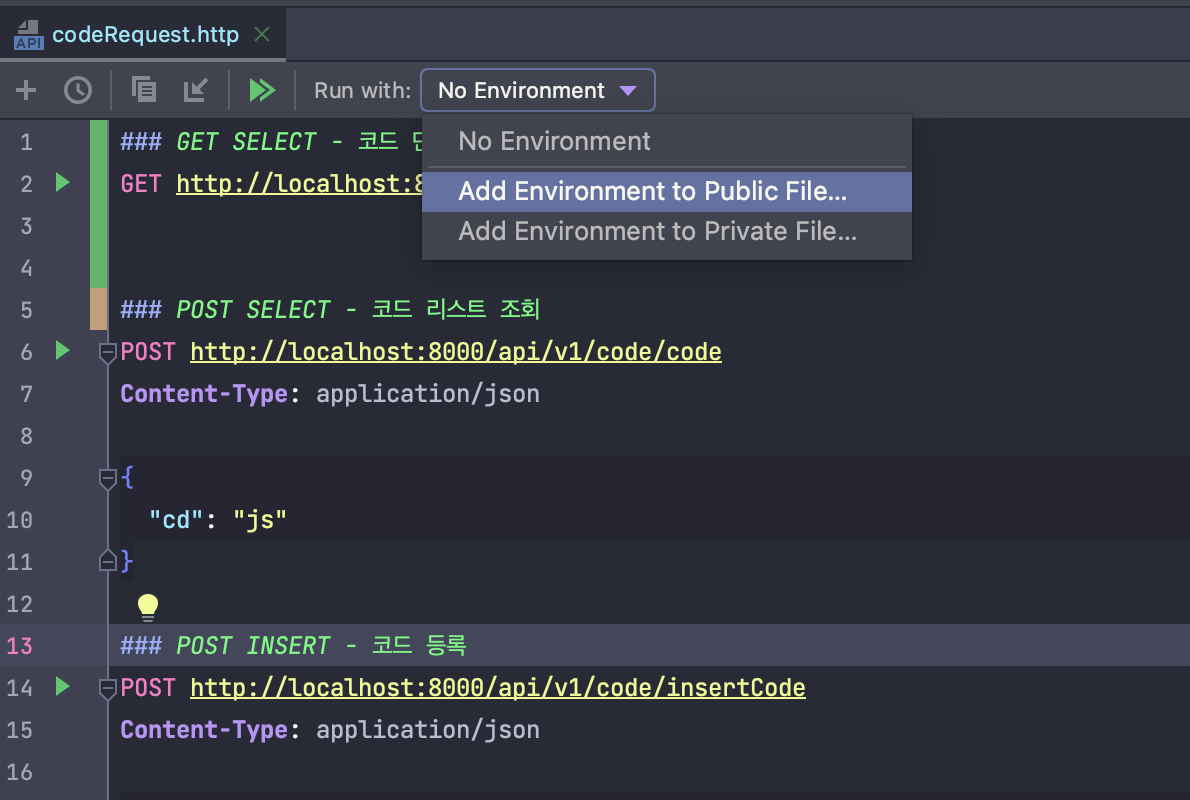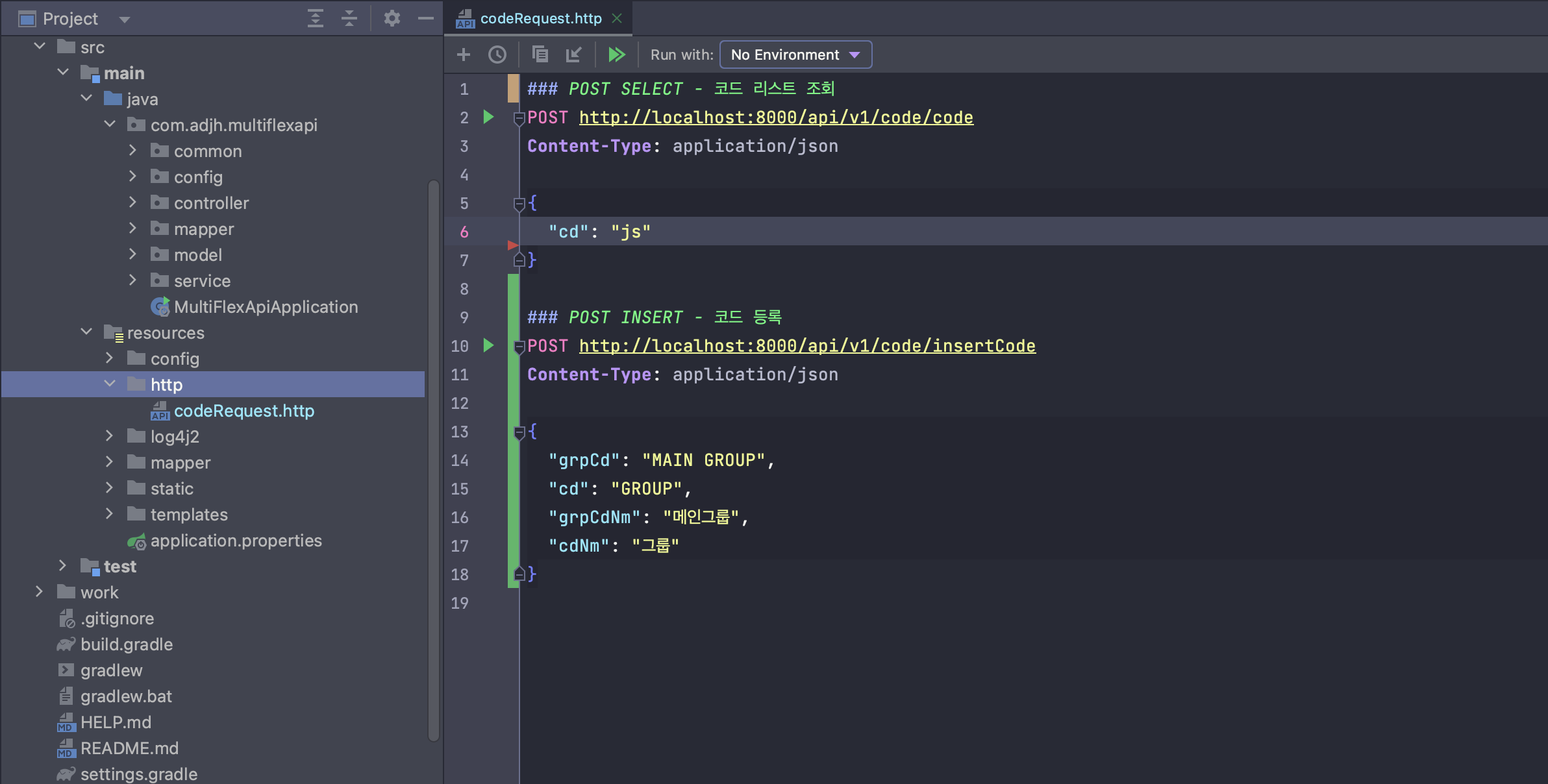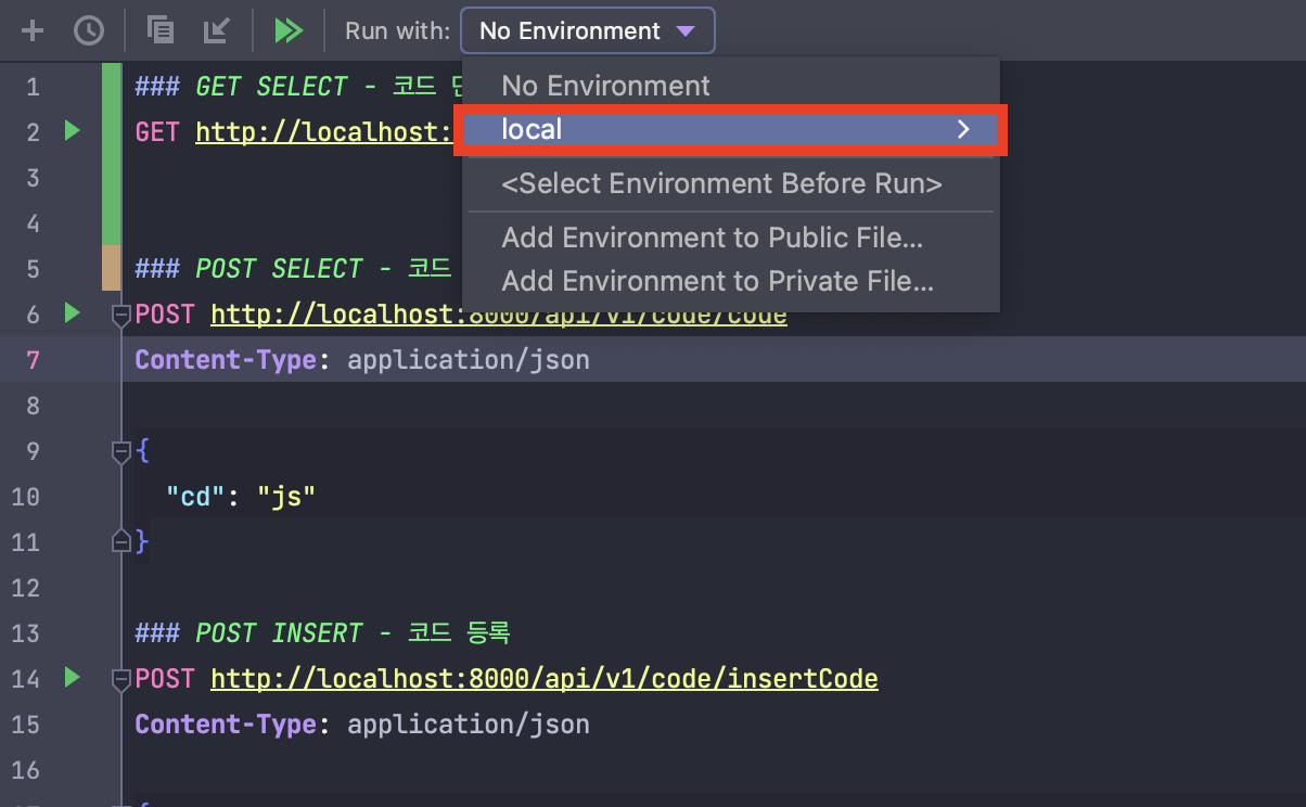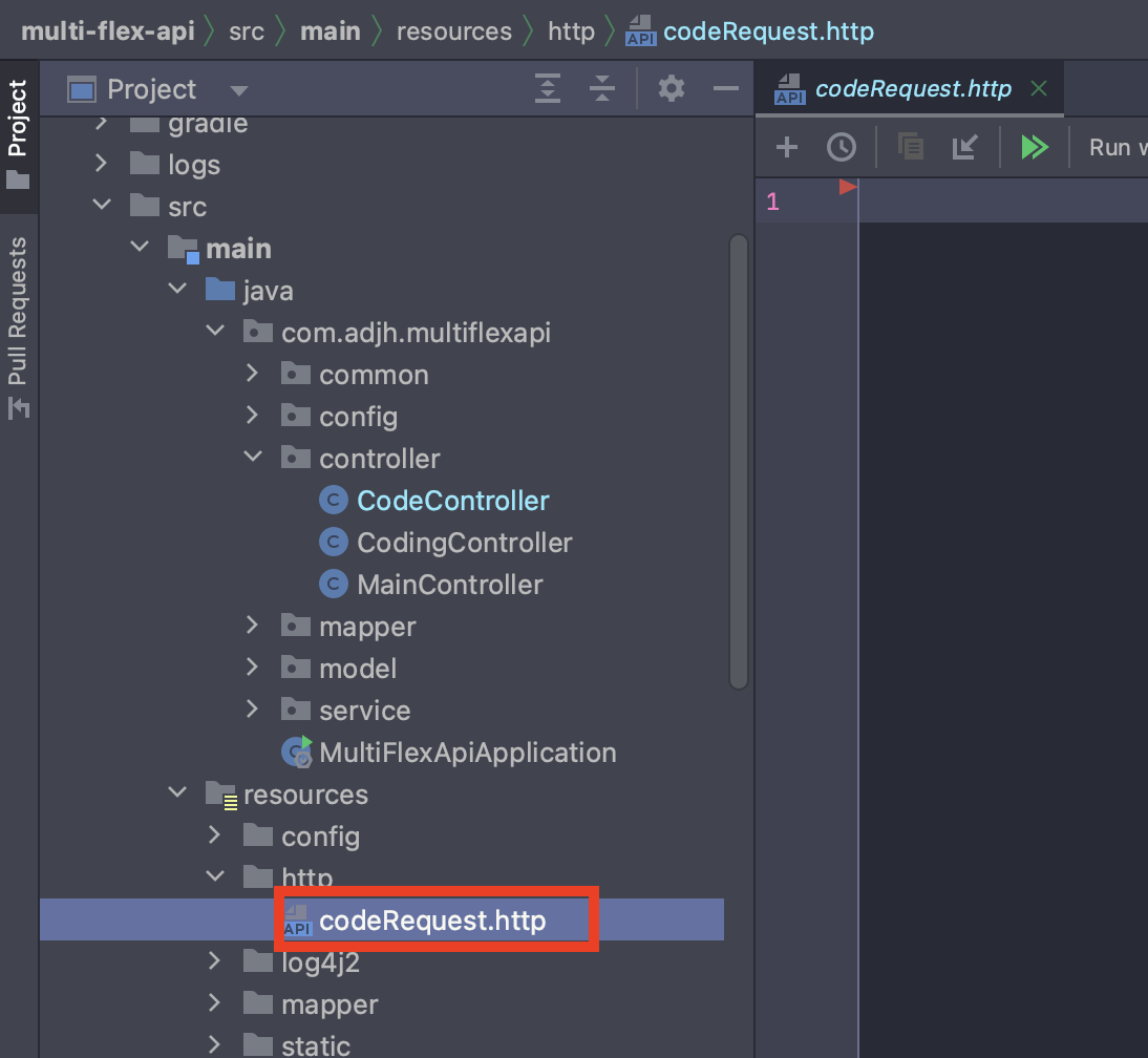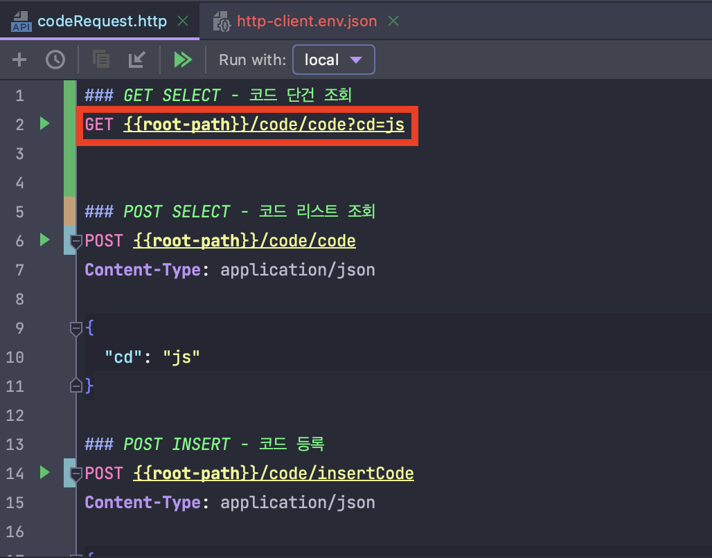💡 프로젝트 내에 resources - http 디렉터리 내에 'codeRequest.http'라는 파일로 구성을 하였습니다.