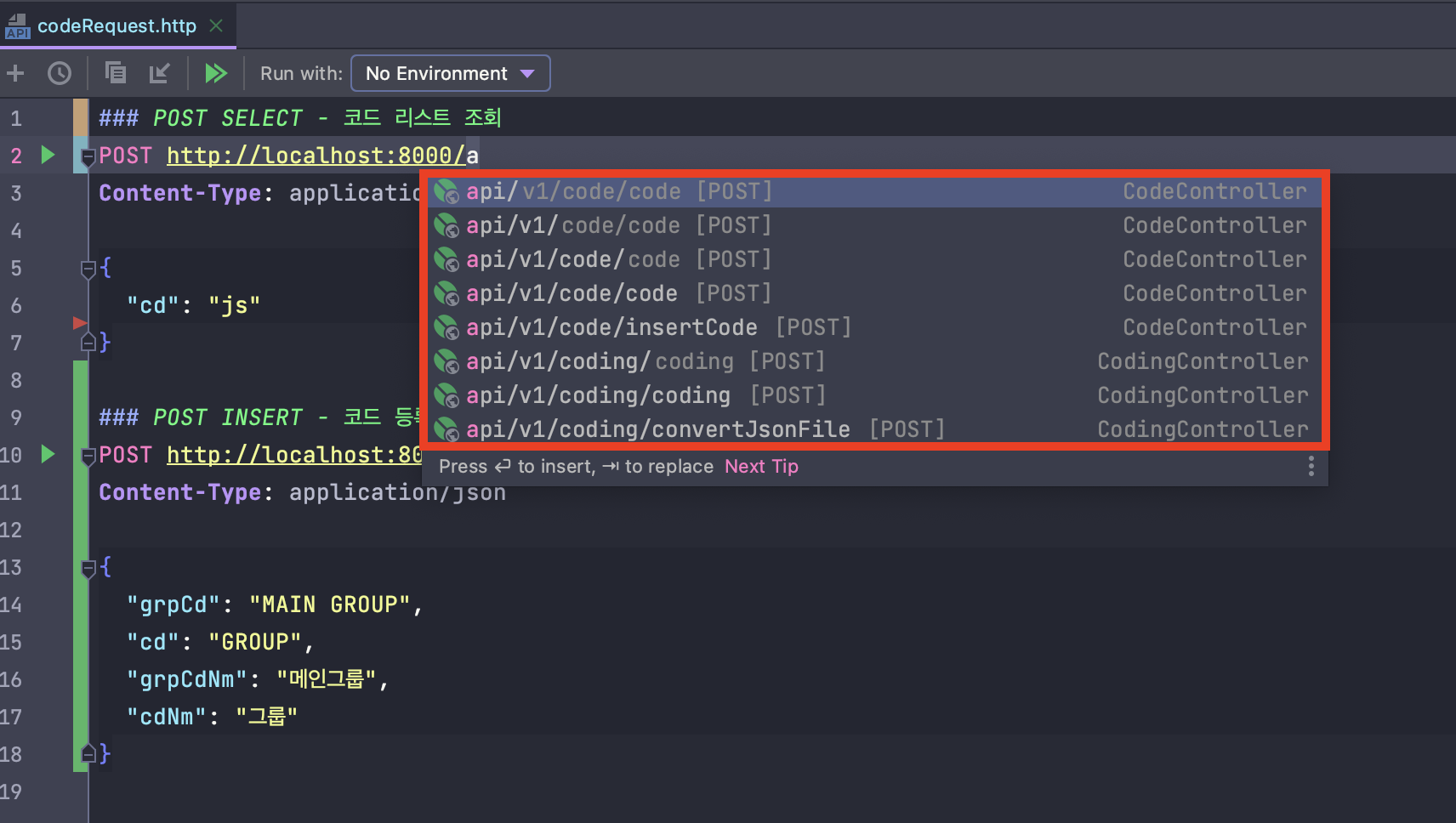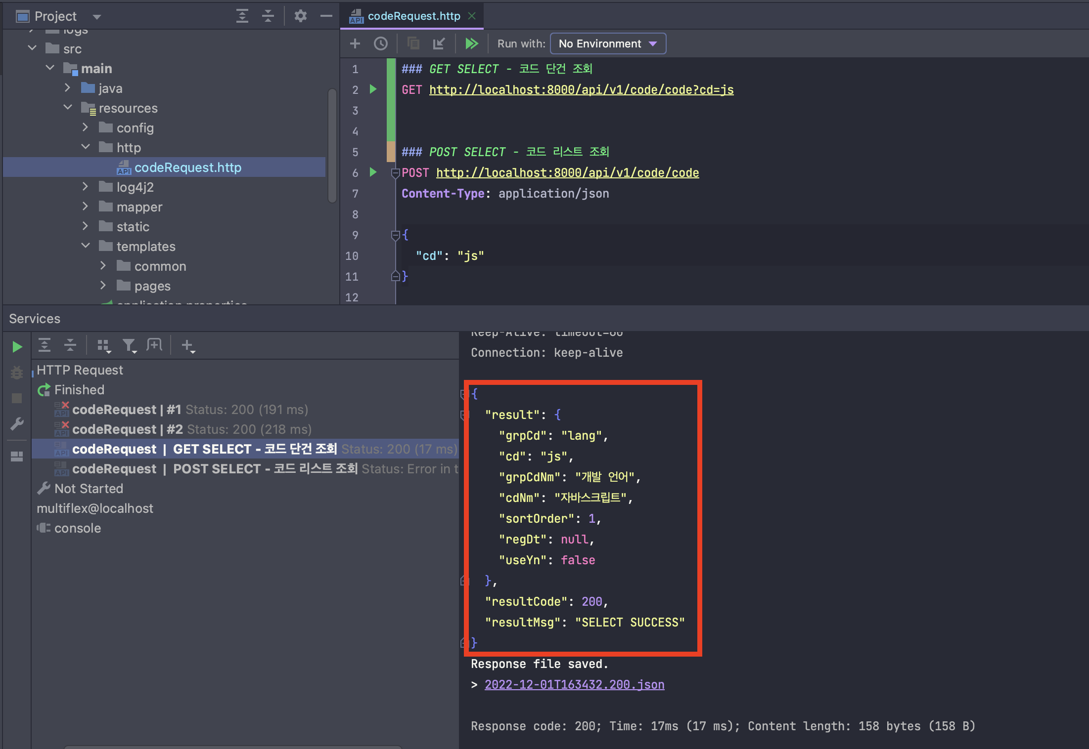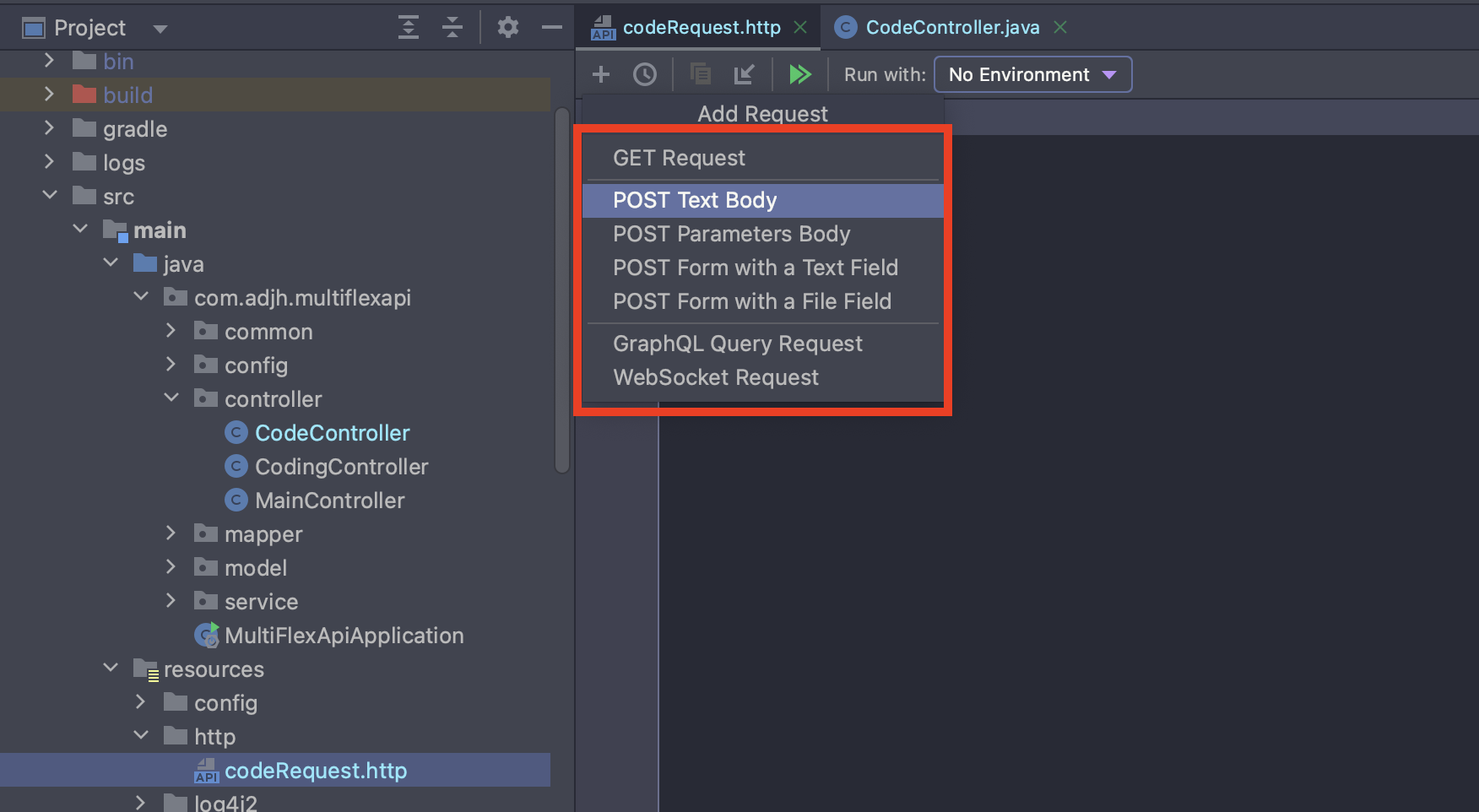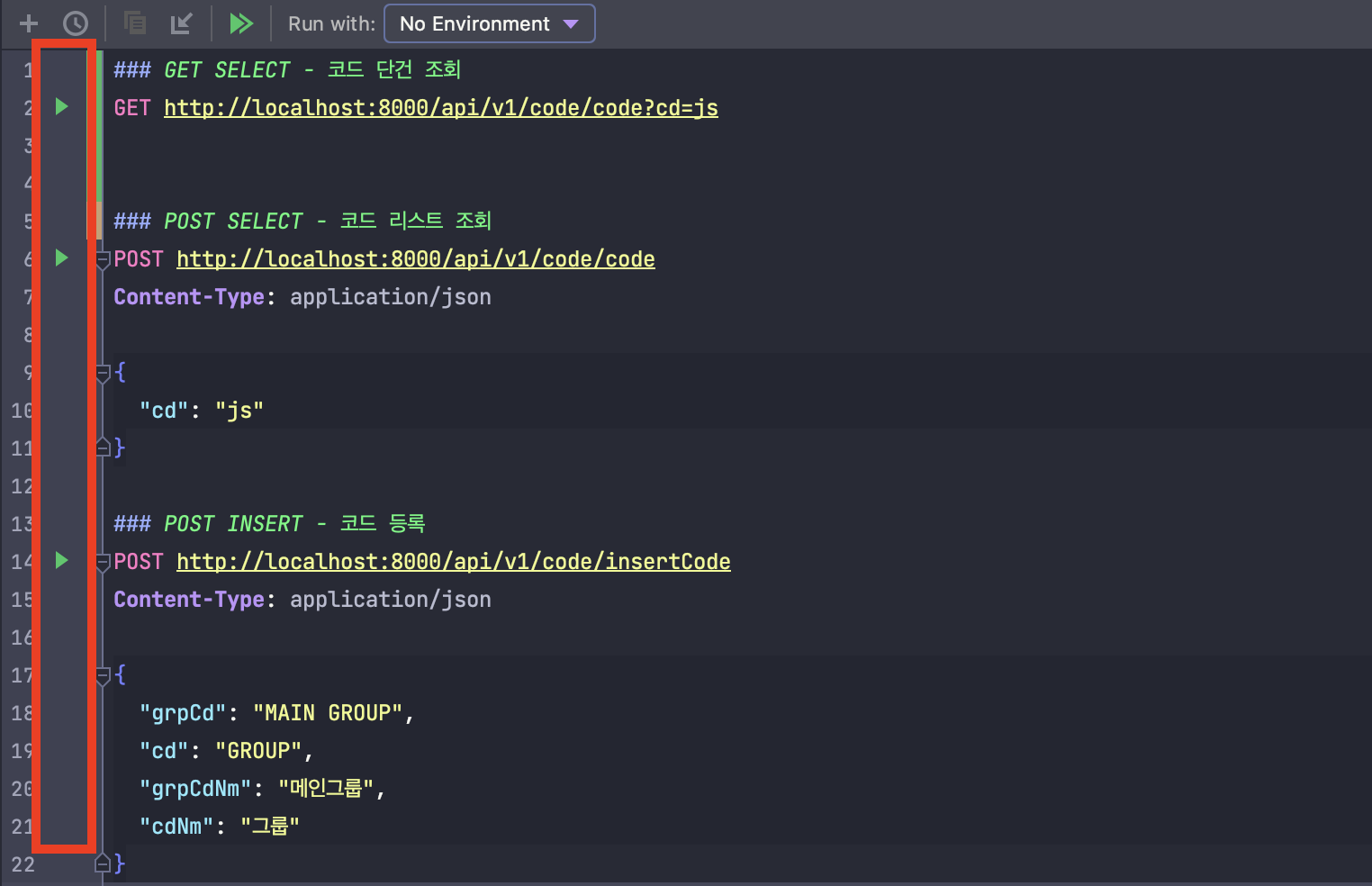 💡 프로젝트 내에 resources - http 디렉터리 내에 'codeRequest.http'라는 파일로 구성을 하였습니다.