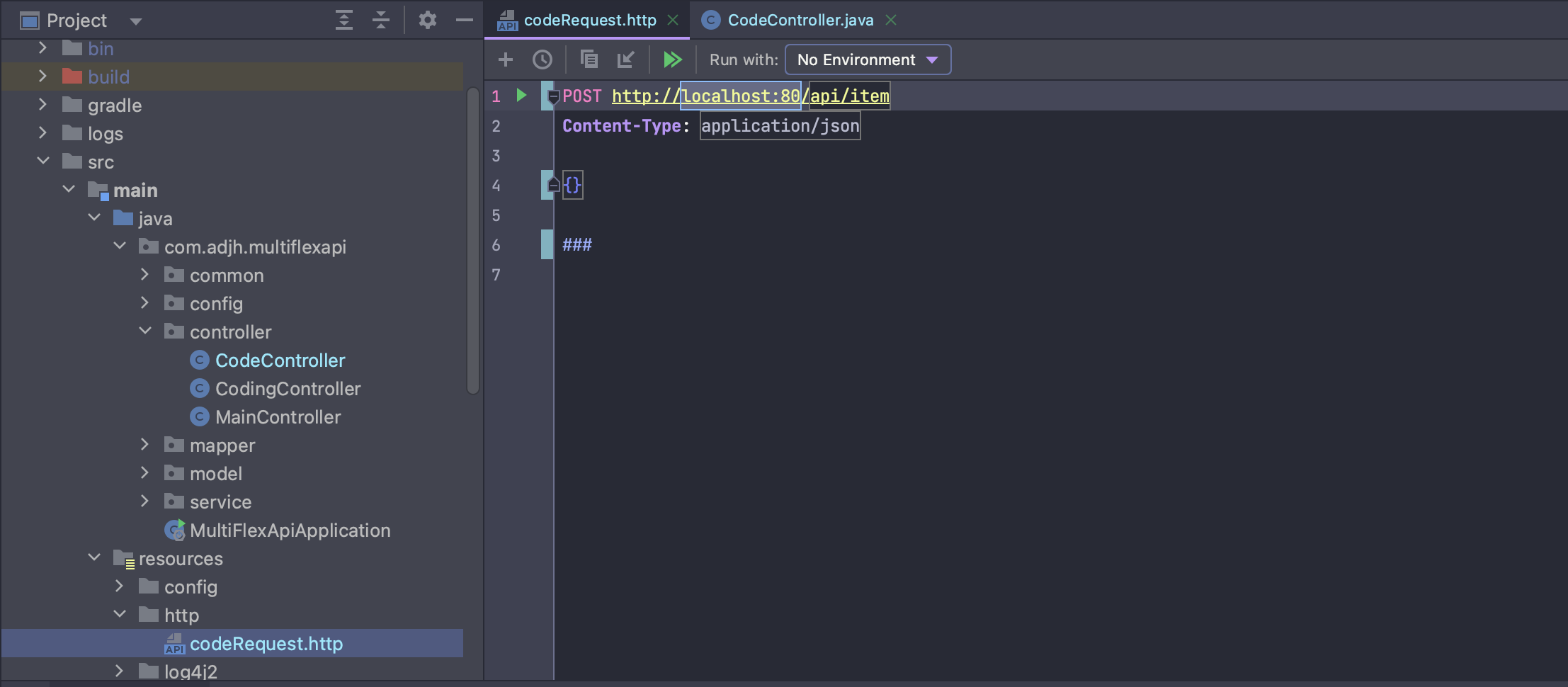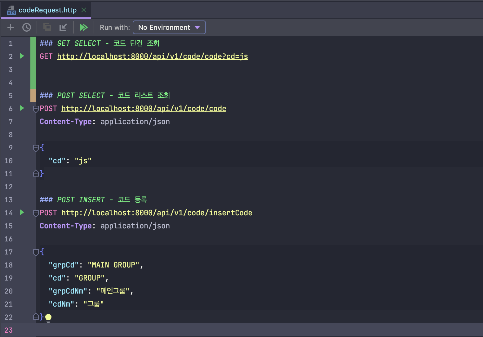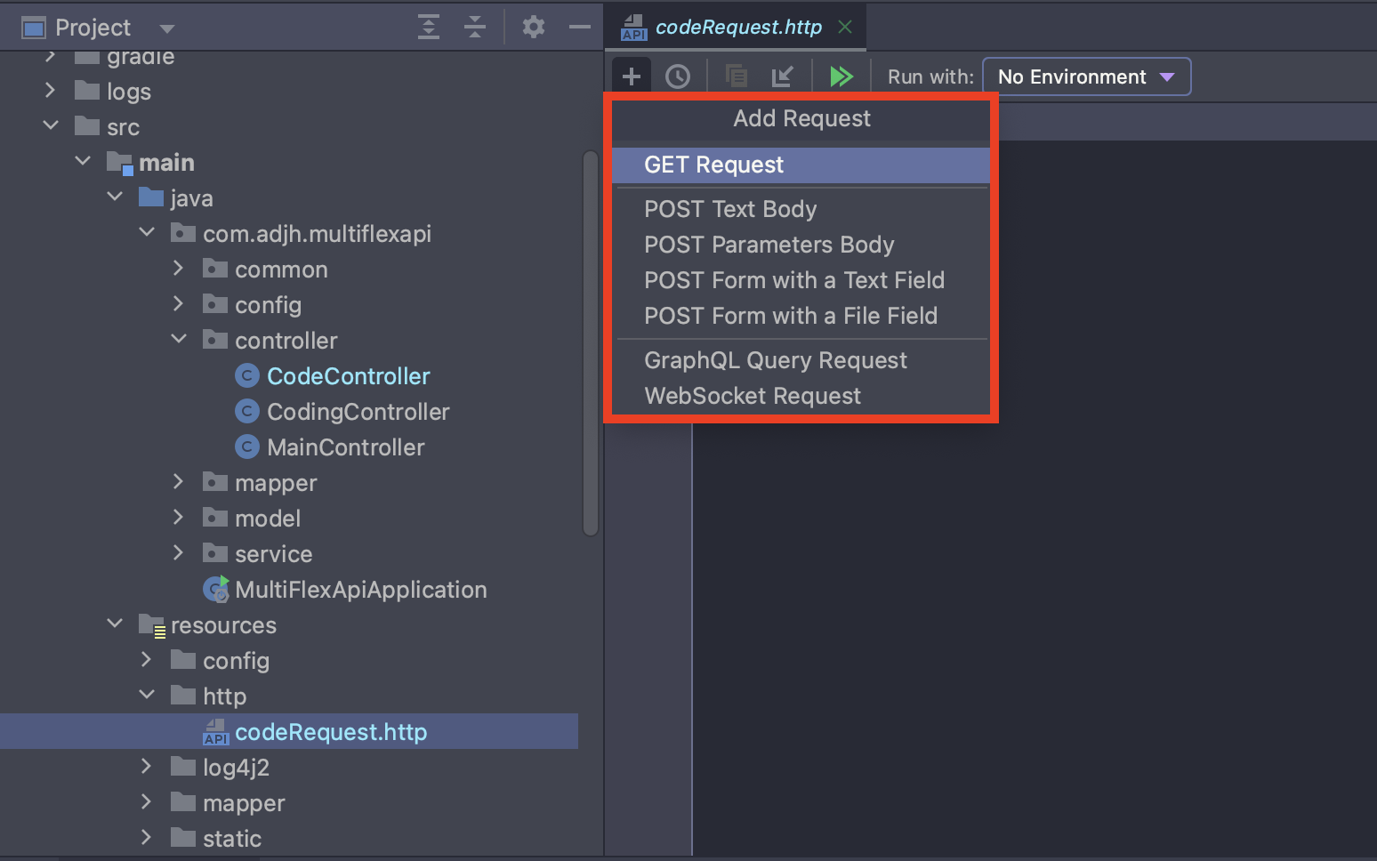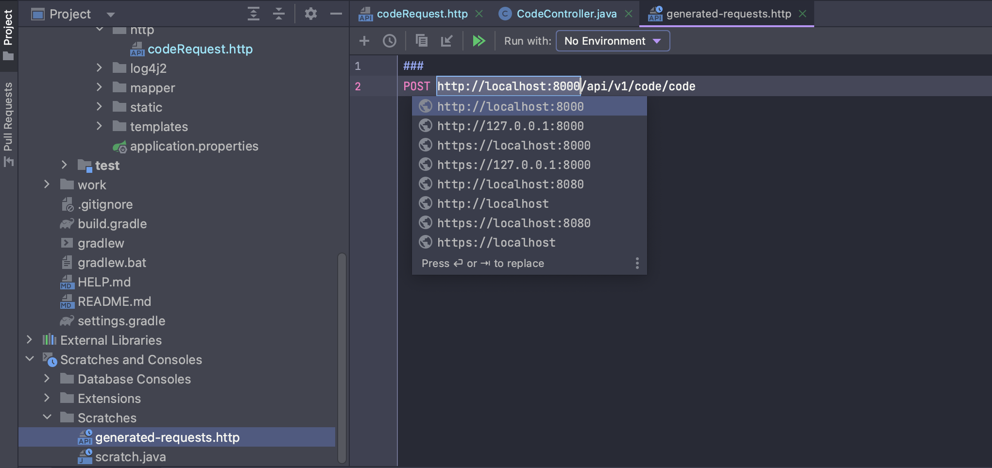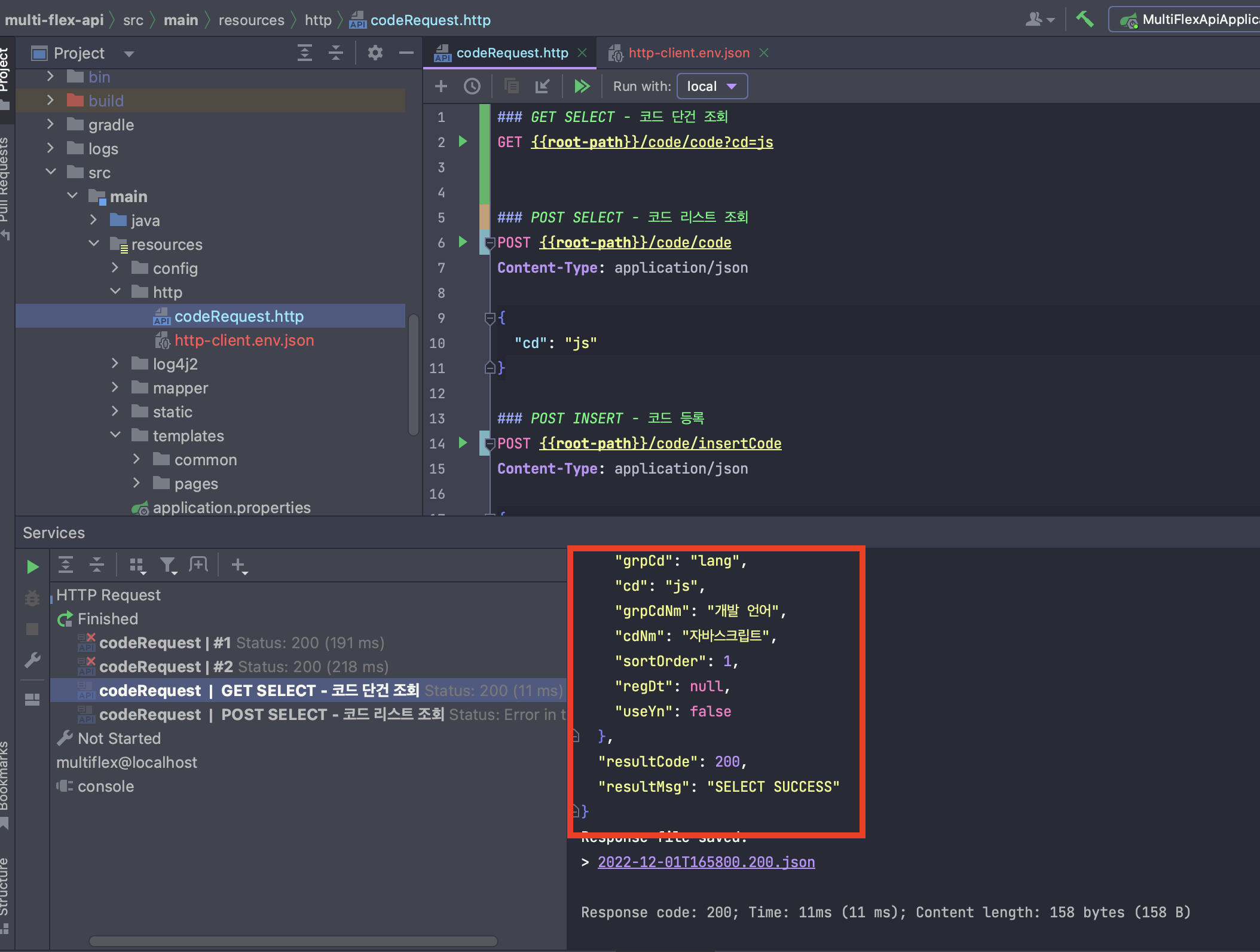 💡 프로젝트 내에 resources - http 디렉터리 내에 'codeRequest.http'라는 파일로 구성을 하였습니다.