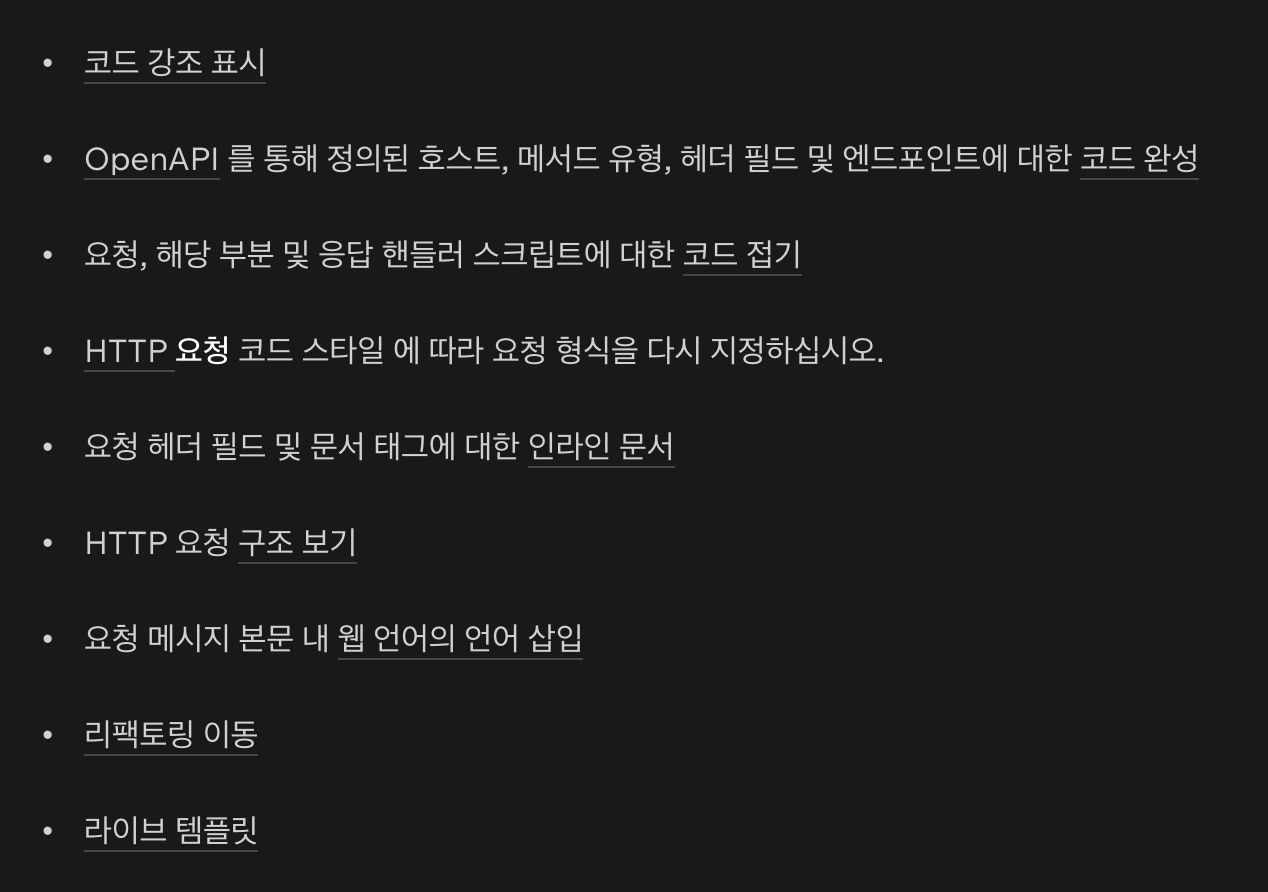 - JetBrain사의 IntelliJ IDEA의 'Ultimate' 라이선스에서 제공하는 플러그인으로 간단하게 설치를 통하여서 IntelliJ IDEA 코드 편집기를 통해서 Restful 및 GraphQL, WebSocket 웹 서비스 내에서 파일을 생성하여 HTTP를 직접 요청하고 실행을 하여 응답을 받을 수 있도록 하는 API 테스트를 도와주는 플러그인을 의미합니다.