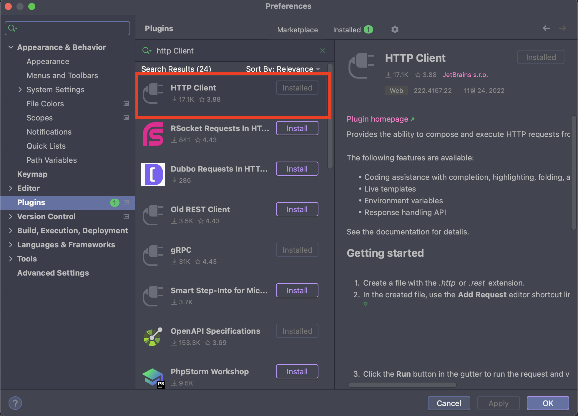 💡 Setting... - Plugins 탭 - HTTP Client 검색 - Install 합니다.