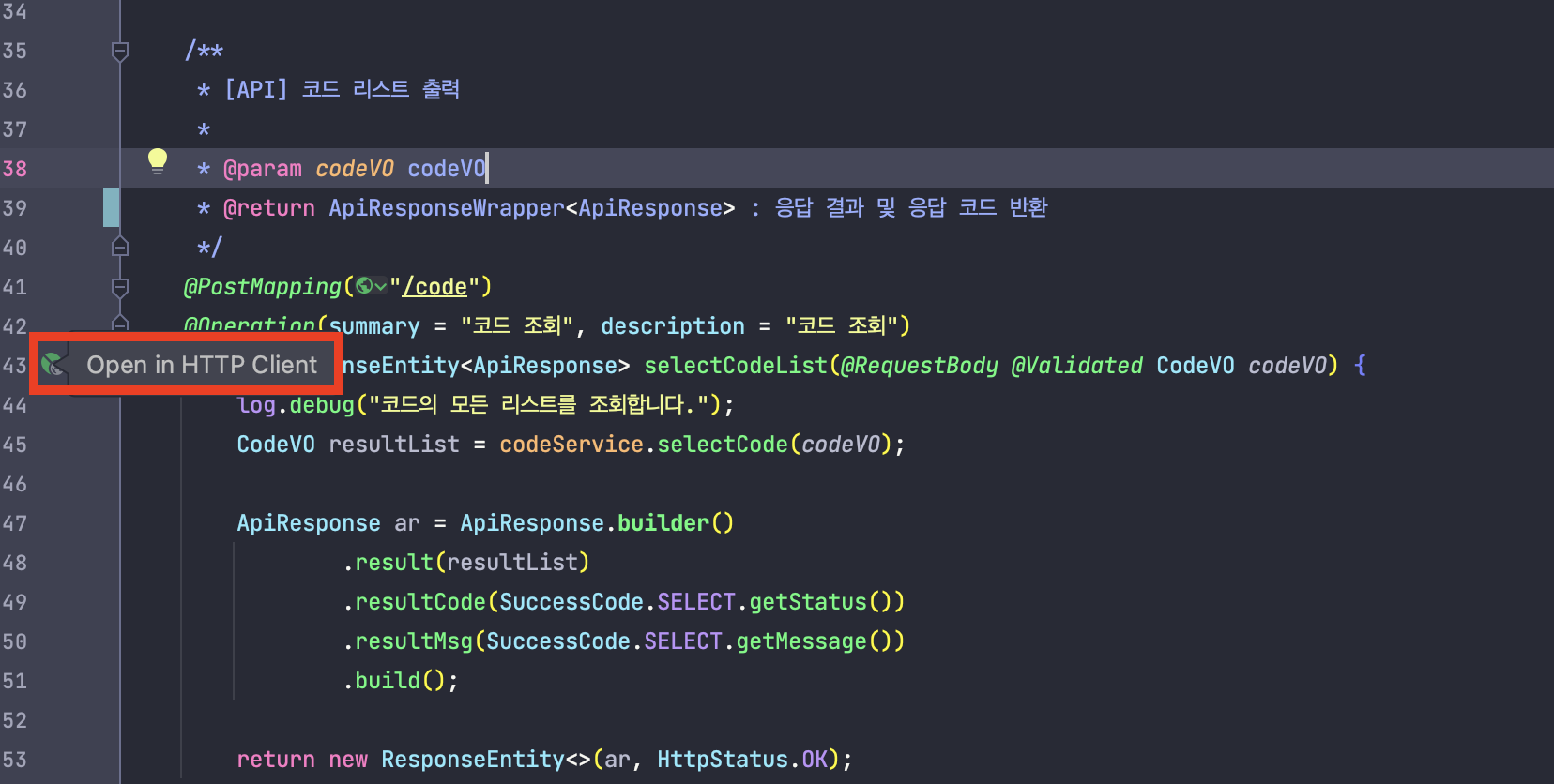 💡 RestController로 class를 구성하여서 POST방식으로 조회를 해오는 API가 있다고 가정하였을 때, 아래의 그림과 같이 'Open in HTTP Client' 버튼이 있습니다. 이를 누릅니다.