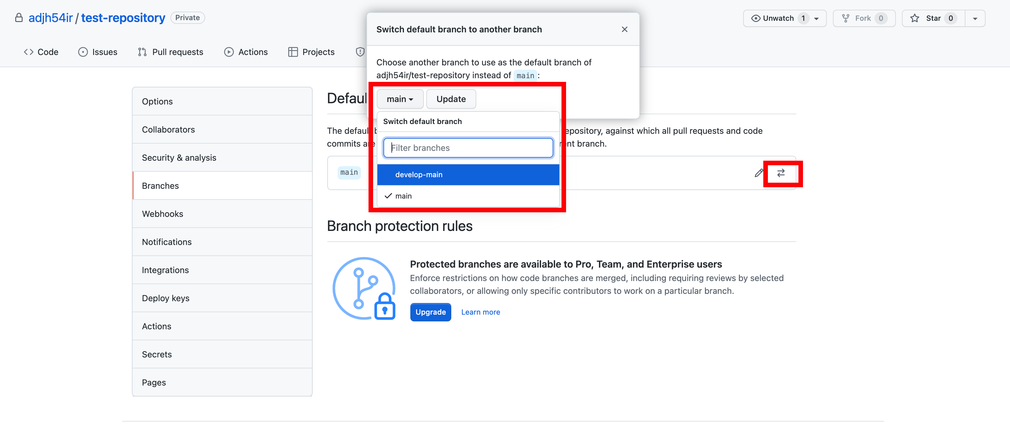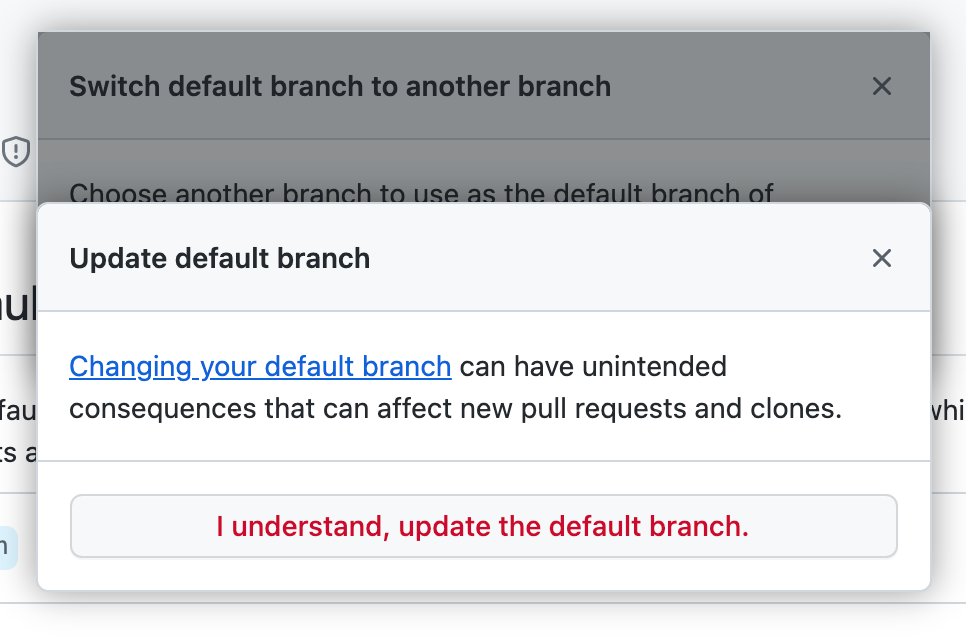 5. [Github] ‘I understand, update the default branch.’ 버튼을 누릅니다.