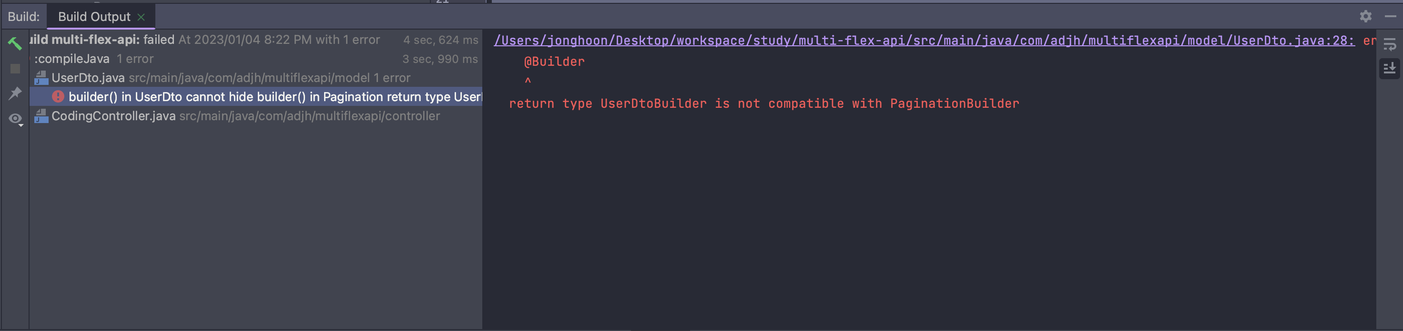 💡 Builder()를 사용하는 도중에 error: builder() in UserDto cannot hide builder() in Pagination 에러를 마주쳤습니다.