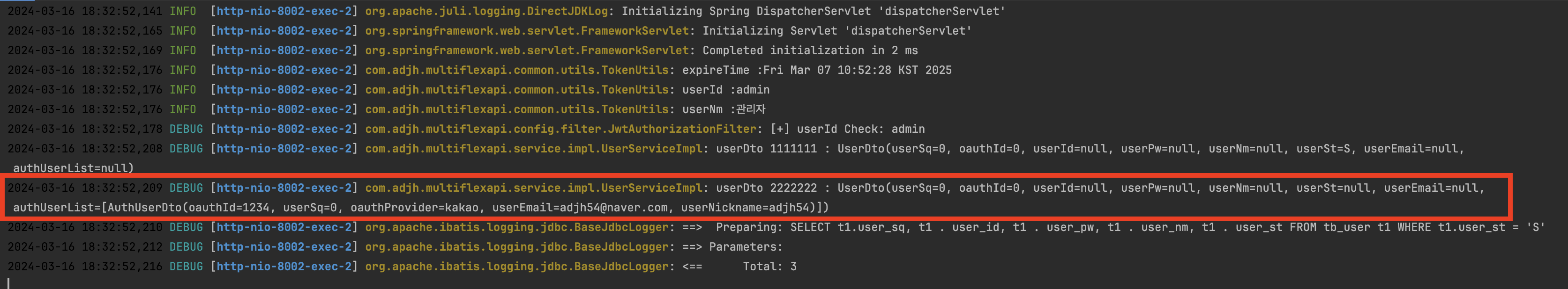 log.debug(userDto1.toString()); // UserDto(userSq=1, userId=adjh54, userPw=null, userNm=Lee, userSt=null)